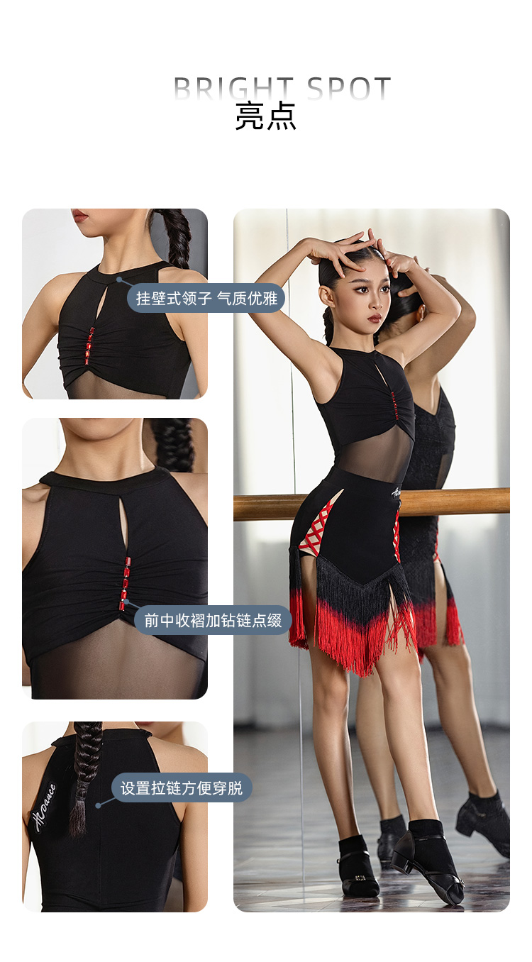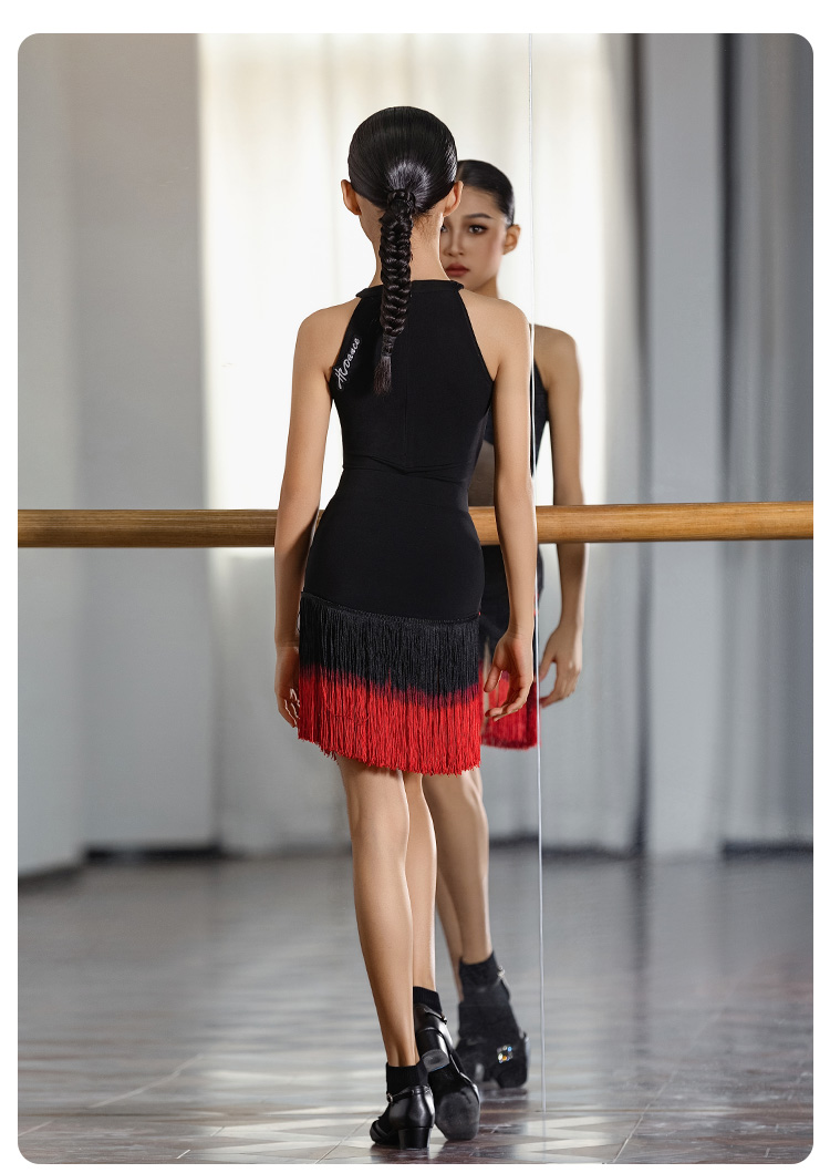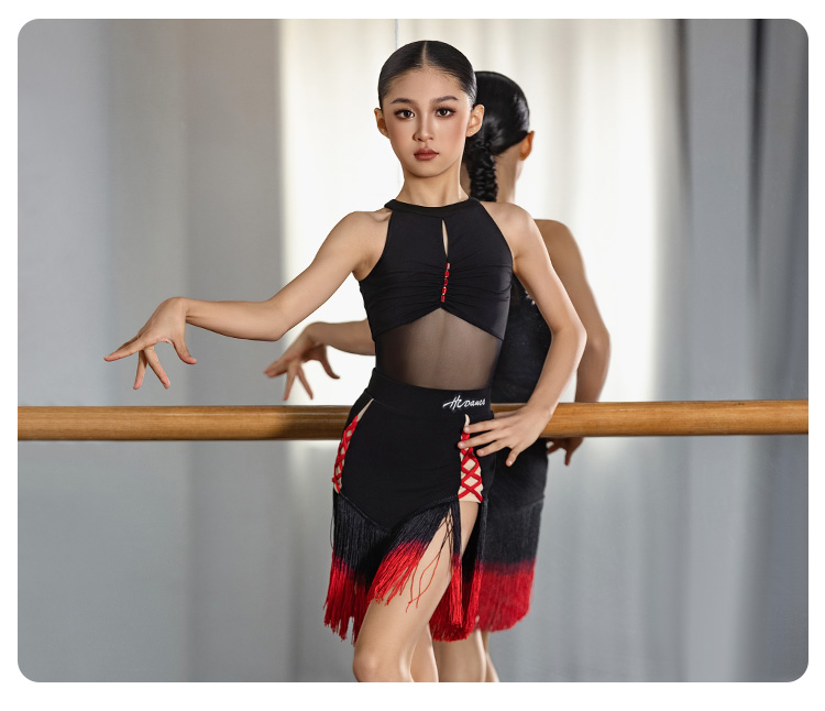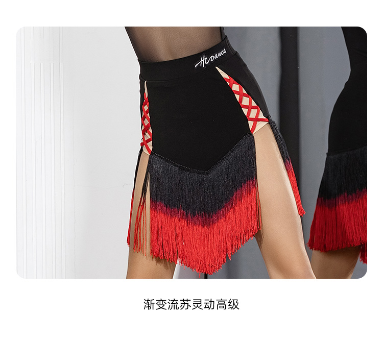 皇朝拉丁新款黑红流苏拉丁舞女练功服练习表演服套装H6436+H7372