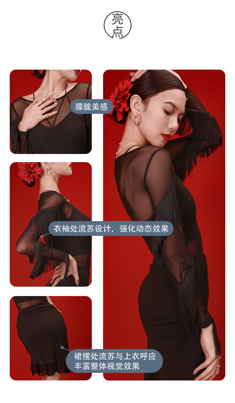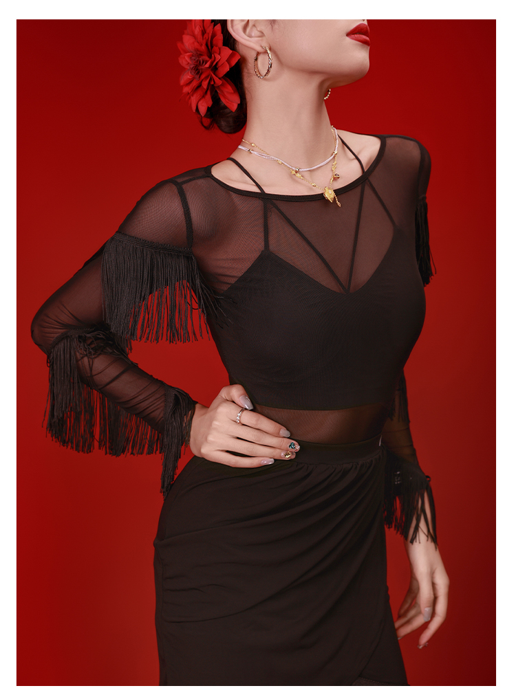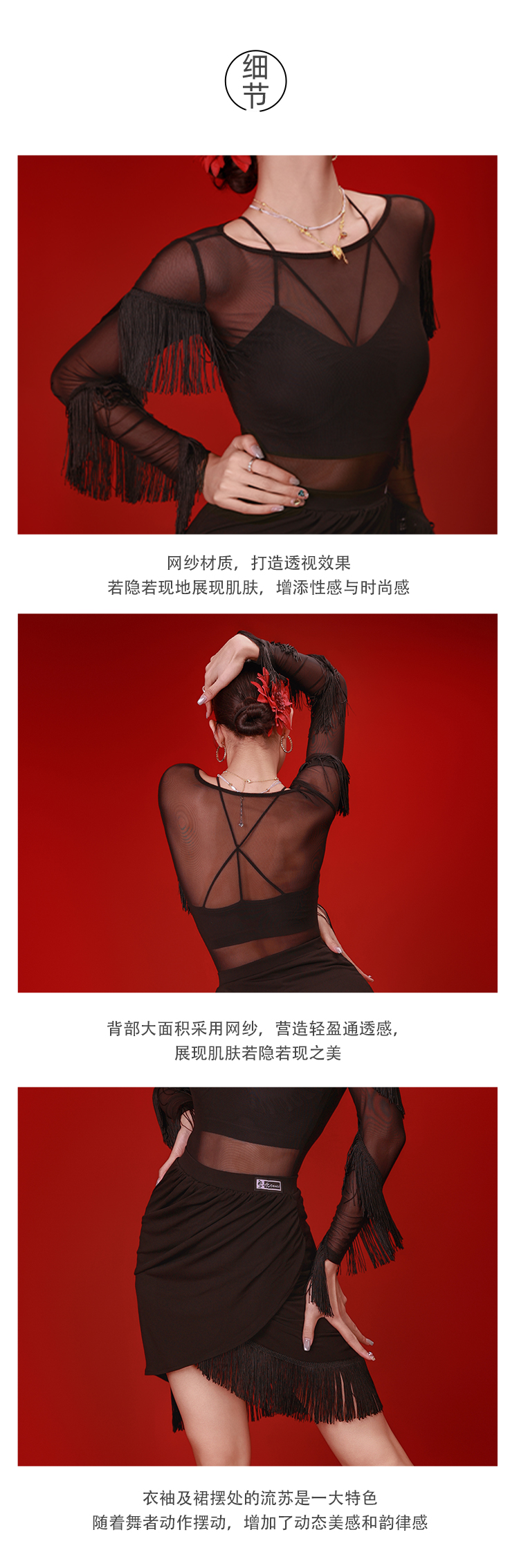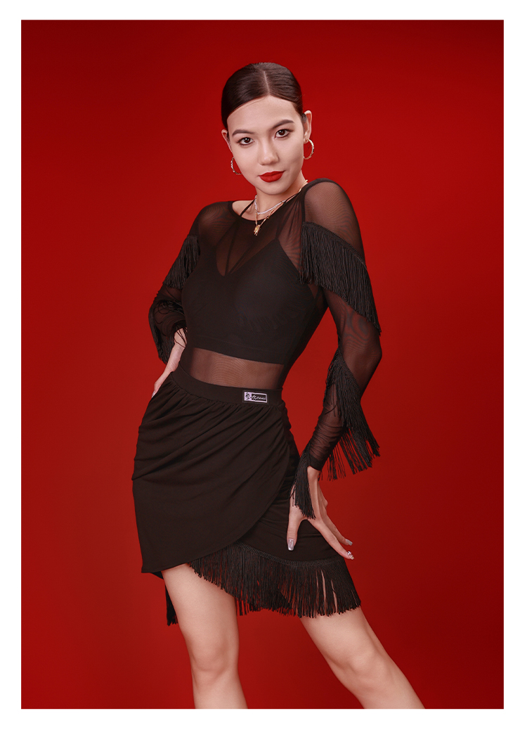 皇朝舞蹈拉丁舞练习服网纱流苏上衣包臀流苏舞裙分体A1063+A2042