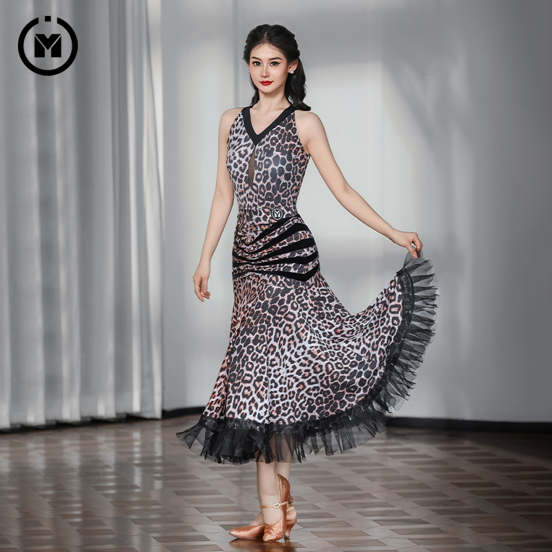 IAMYC华尔兹舞裙女新款咖豹V领无袖上衣摩登舞裙B10136+B20093