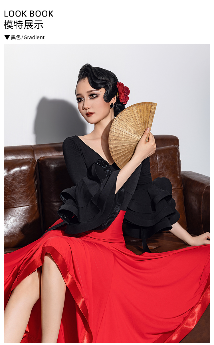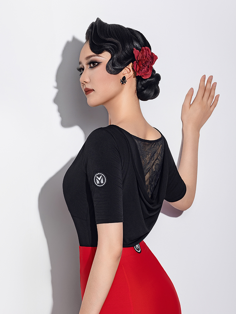 IAMYC摩登舞服新款华尔兹舞服百搭V领后背蕾丝荡领连体上衣B10177