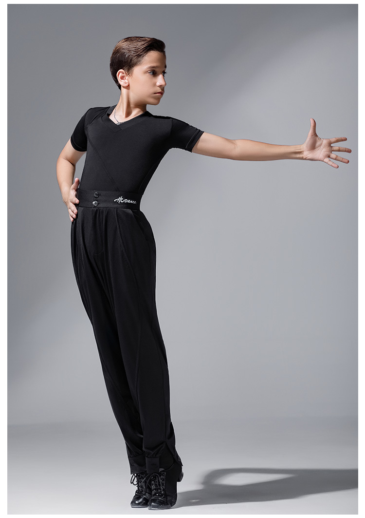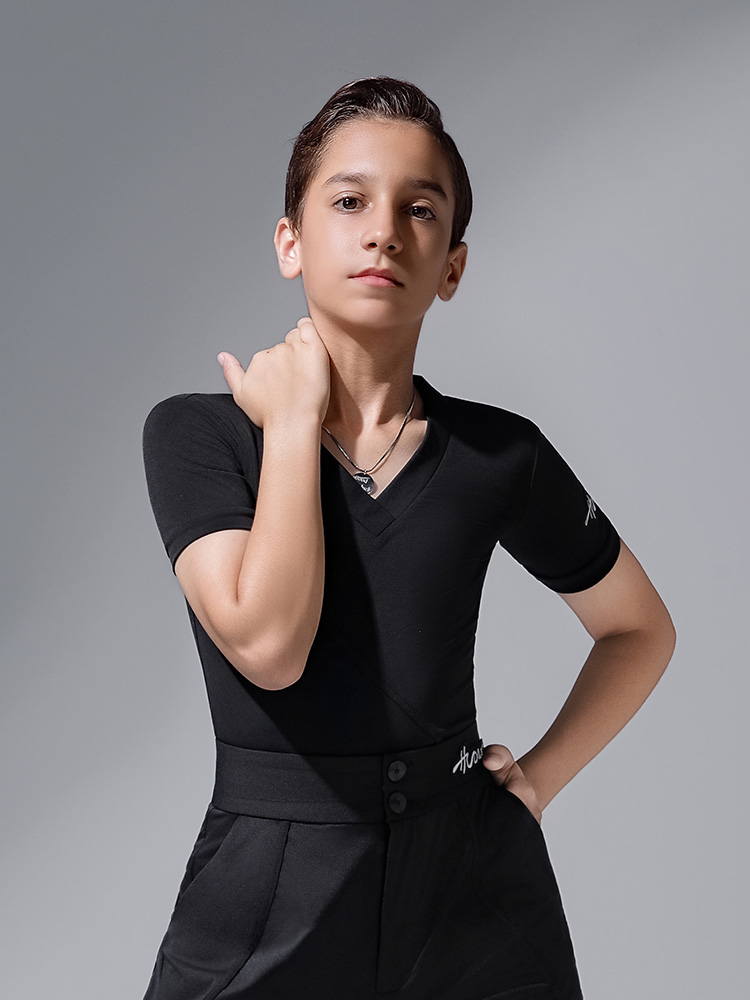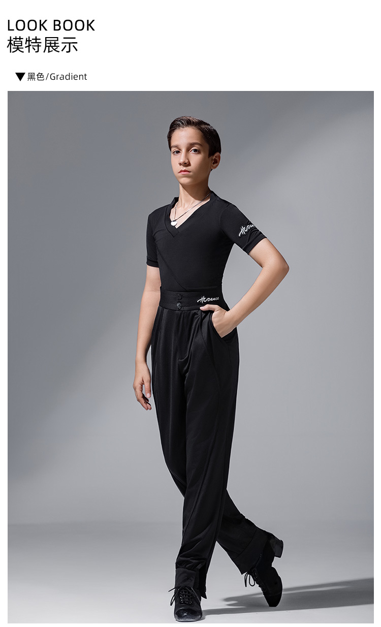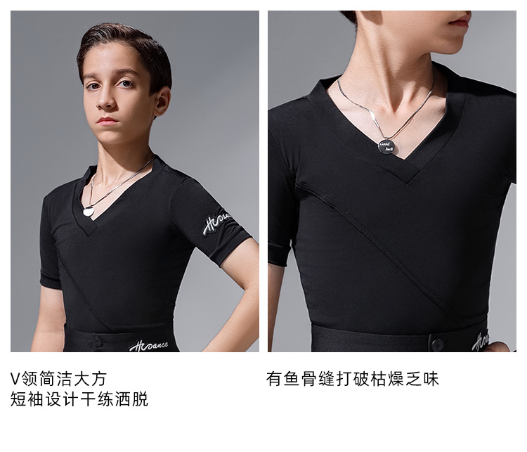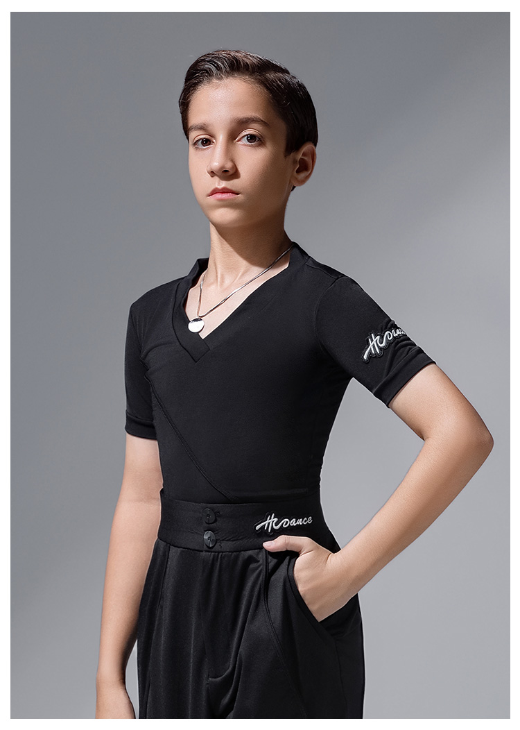 皇朝拉丁新款拉丁舞服男童练功服儿童短袖上衣黑色训练服 HN5096
